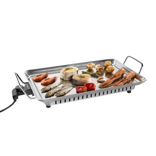 Plancha de cocina eléctrica de 1600W de potencia y de calidad profesional. Superficie de acero inoxidable de larga duración. Distribuye de manera uniforme del calor y posee un termostato Pro de alta precisión. Puede ubicarse en cualquier lugar por sus 2 metros de cable. No perjudica medio ambiente: sin PFOA y sin PTFE
